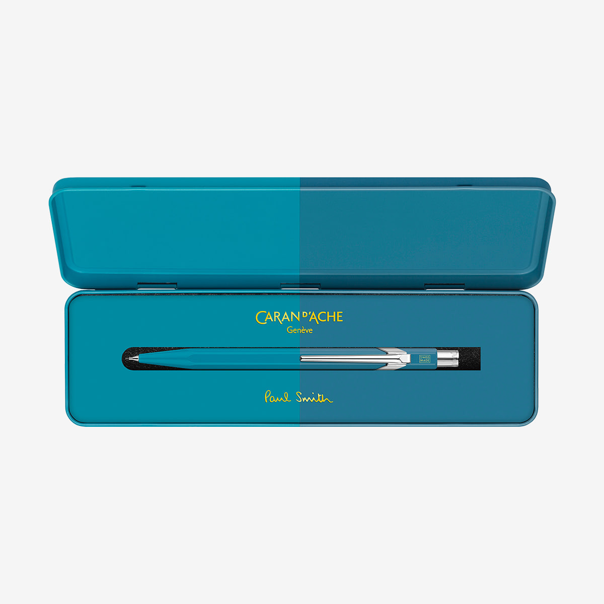 Two-tone metal box branded Caran d’Ache + Paul Smith in gold reflecting the design of the mechanical pencil