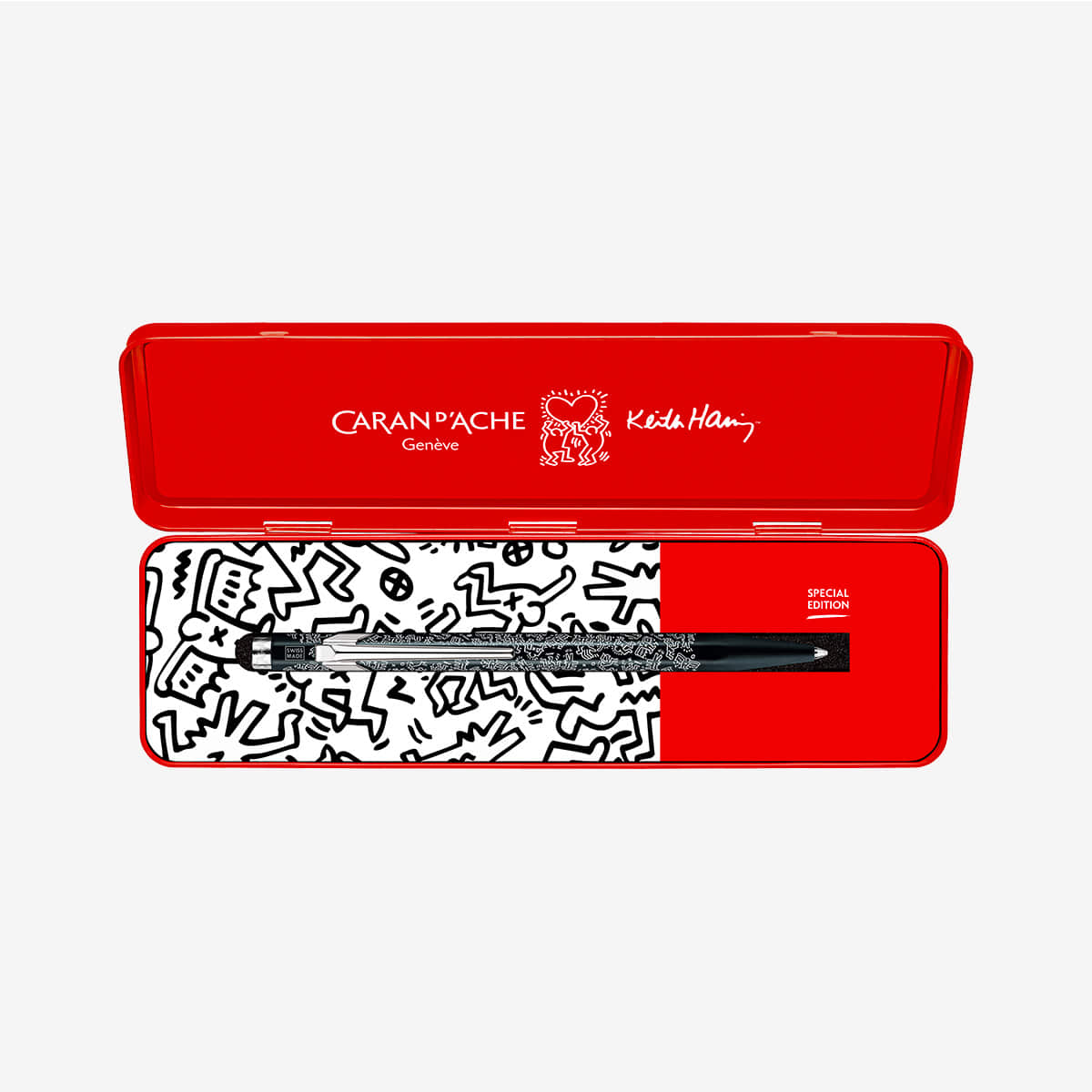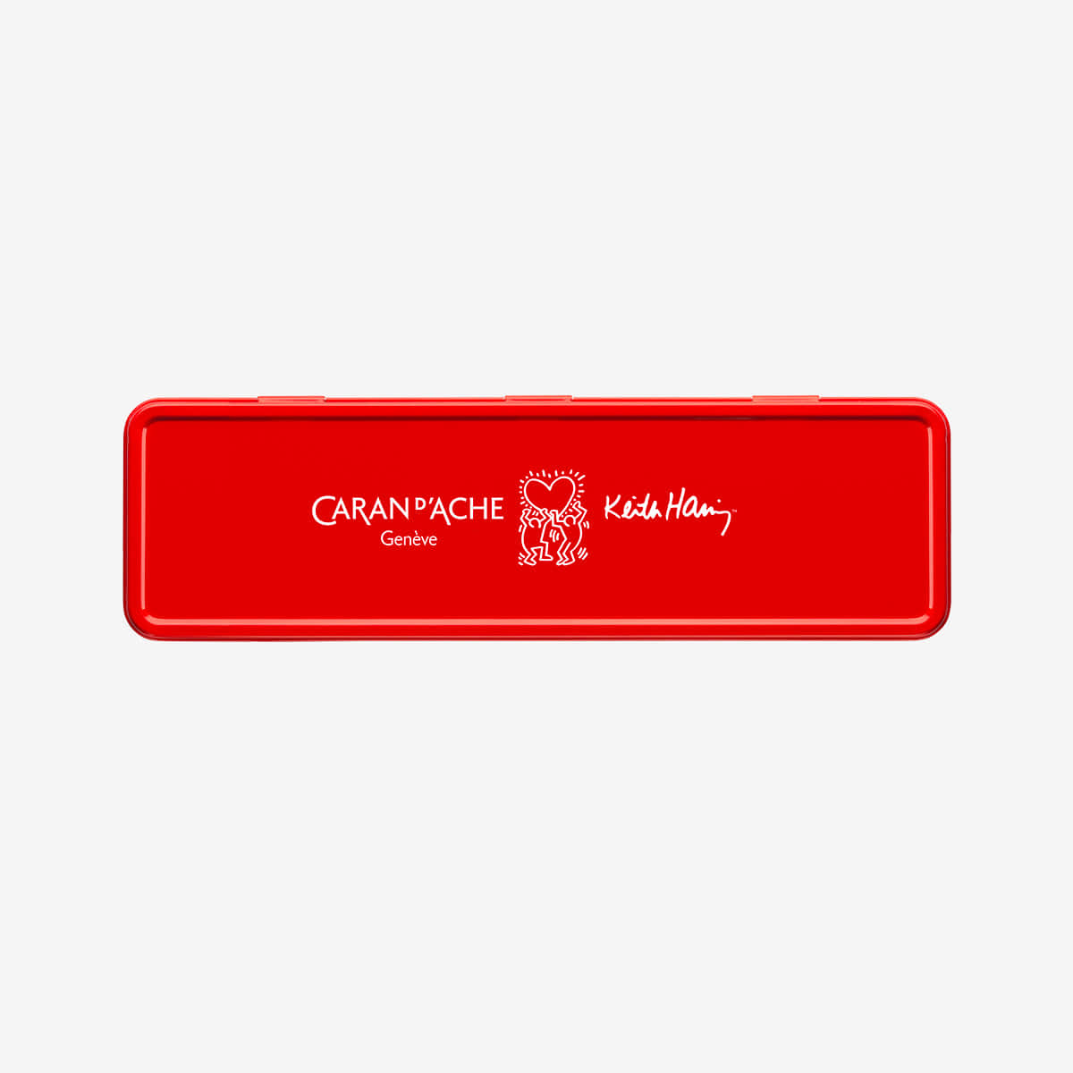 Collector’s red metal box signed with the partnership logo and sheath adorned with the collection’s identity – iconic Keith Haring pattern and Caran d’Ache red