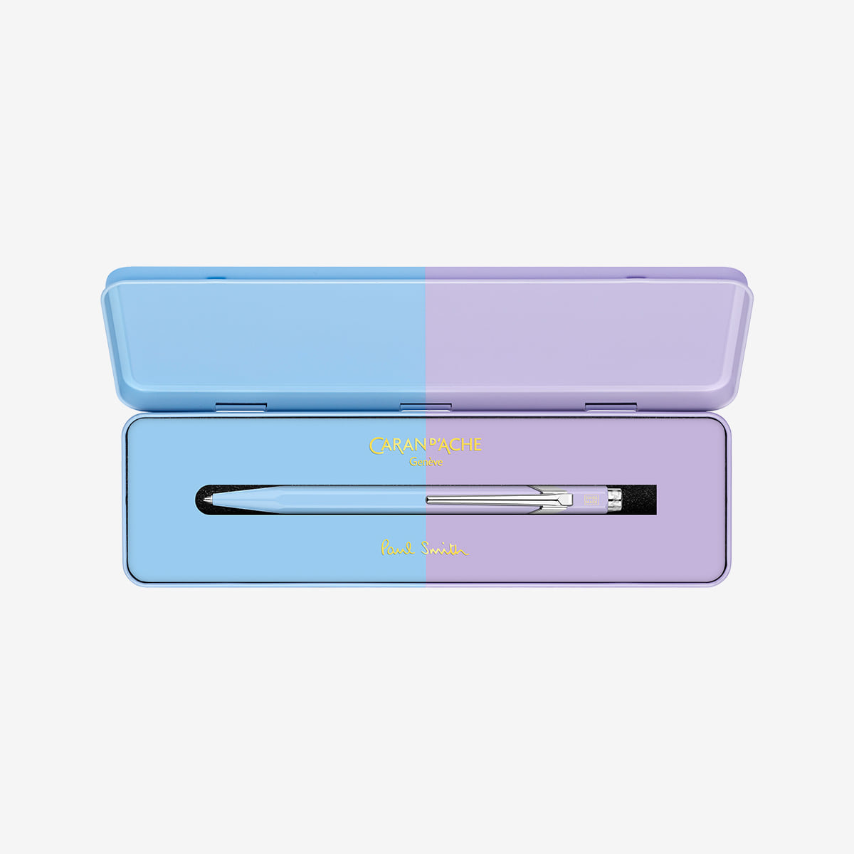 Two-tone metal box with the design of the pen and the Caran d’Ache + Paul Smith brand in gold