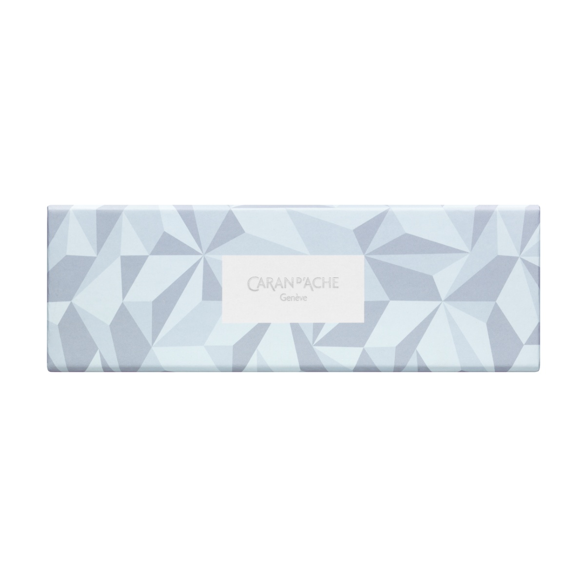 Premium cardboard box adorned with frosty blue and white geometric motifs, echoing the faceted effect of winter frost