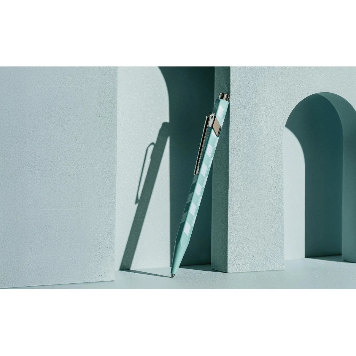 Satin-finish water green lacquered body with a pastel green stamped geometric pattern