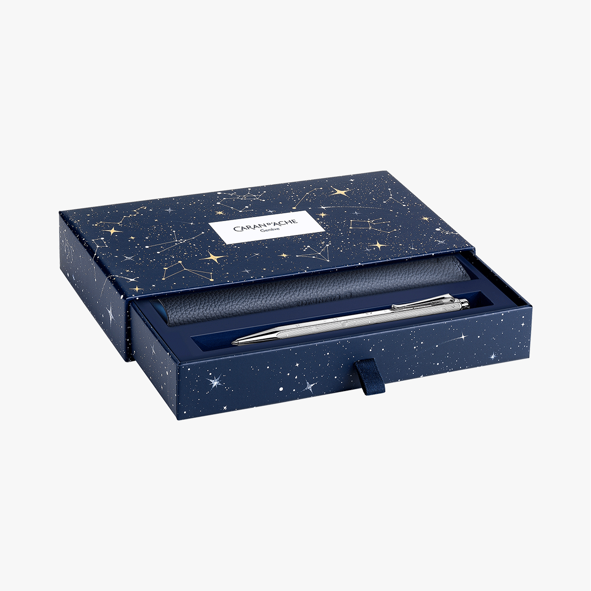 Midnight blue premium cardboard box covered in gold and white galactic patterns with ribbon drawer
