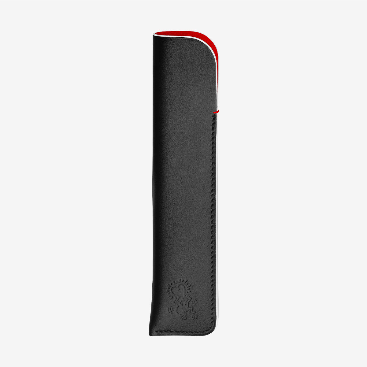 “Exterior in smooth, black cowhide leather embossed with one of Keith Haring’s character; red interior enhanced with top-stitching in the same colour and white edge finishing”