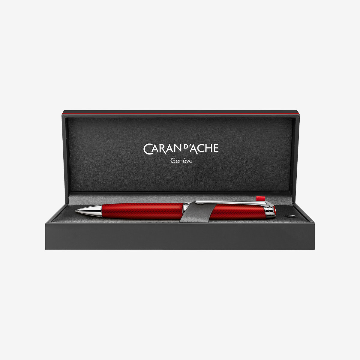 Cap button carrying the new Caran d’Ache identification (carmine red lacquered hexagon)
